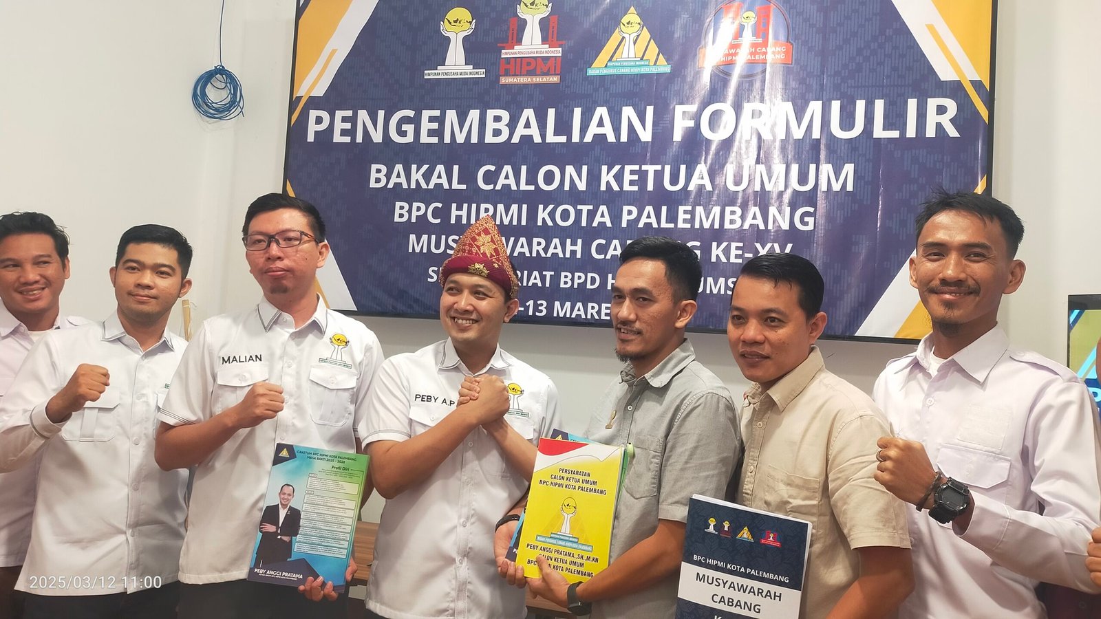 BERITAPRESS|PALEMBANG – Mengenakan kemeja putih dan topi tanjak serta didampingi para timses, Peby Anggi Pratama gerak cepat mengembalikan formulir Bakal Calon Ketua Umum BPC HIPMI Kota Palembang, Rabu (12/3/2025).